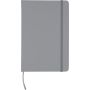 A5-ös méretű jegyzetfüzet rPET PU anyagból készült kemény borítóval, 80 vonalas lappal (70g/m2), színben illeszkedő gumipánttal és könyvjelző szalaggal. Az újrahasznosított anyagra utaló dombornyomott logóval a füzet hátoldalán.