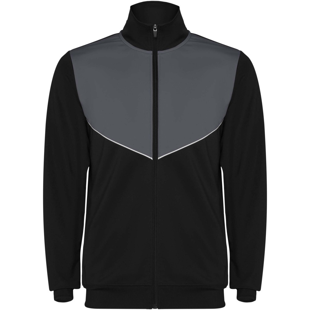 Könnyű és rugalmas anyagból készült melegítő. A végig cipzáros felső kontrasztos színű és varrású díszítésekkel dekorált a mellrészen. Oldalzsebek. Bordázott ujj- és és derékpasszé. Nadrág gumis derékkal és húzózsinórral, kontrasztos oldalsó varrással. Cipzáras szegély.