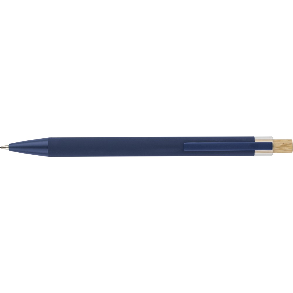 Újrahasznosított alumíniumból készült golyóstoll bambusz nyomógombbal és AS műanyag díszítéssel, fém klippel és a toll színével harmonizáló műanyag tollheggyel. A tolltesten lézergravírozott recycled (újrahasznosított) alapanyagra utaló logó található. Megközelítőleg 800 méter íráshosszúságú, kék színű tollbetéttel.