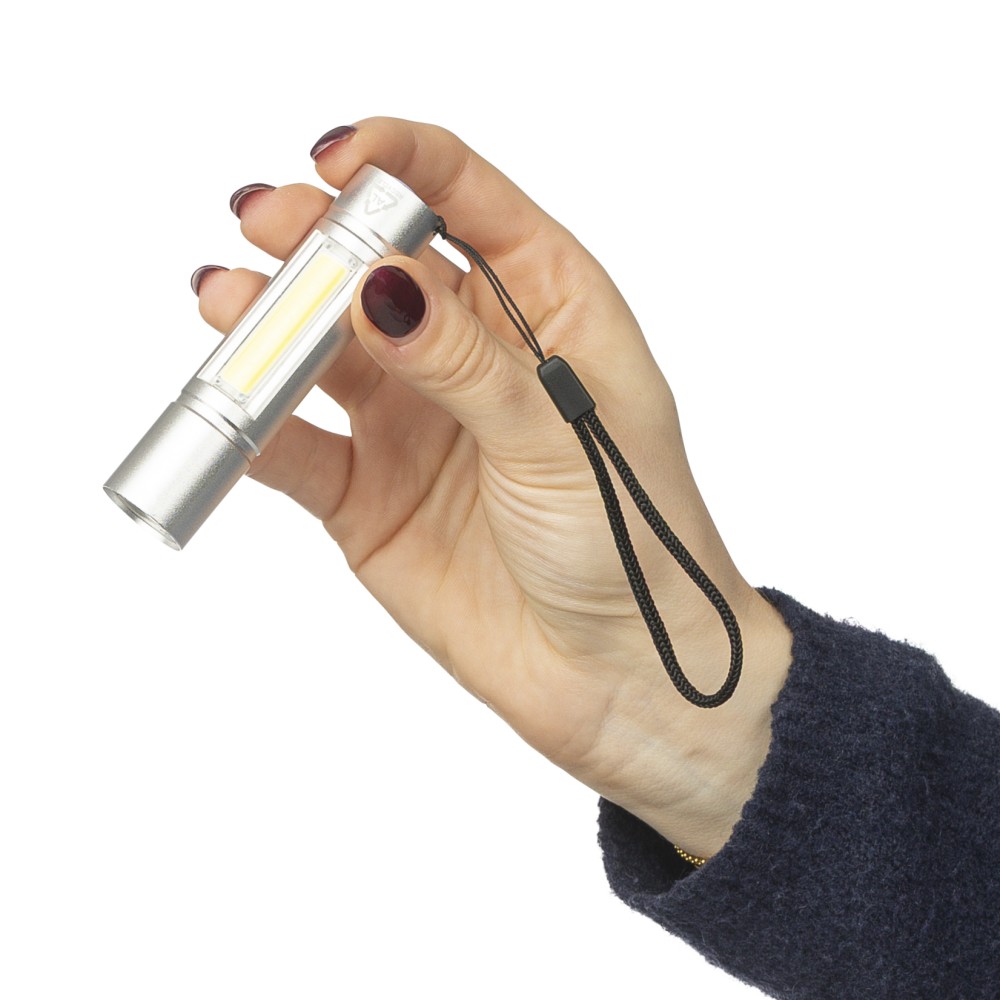 Újrahasznosított alumíniumból készült COB zseblámpa (80-100 lumen) 3 világítási móddal, nyomógombbal, csuklópánttal és gravírozott recycled (újrahasznosított) alapanyagra utaló logóval. USB-C-n keresztül újratölthető (300 mAh), a csomag része egy 30 cm-es kábel. Illusztrációval ellátott barna dobozba csomagolva.