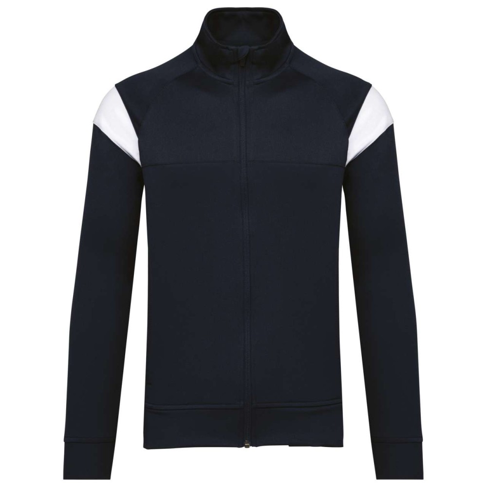 Anyaga: 100% matt poliészter interlock. Egyenes szabás. Elöl fordított cipzáras záródás színazonos nejlonból. Raglán ujjak kontrasztos vállbetétekkel. Kontrasztos mell- és vállkialakítás. Két cipzáras elülső zseb. Texturált anyagbetétek az oldalakon és a hátrészen. Cipzárfedő a felső nyakkivágásnál a nagyobb kényelem érdekében. Könnyen eltávolítható márkajelzés a dekorációhoz.