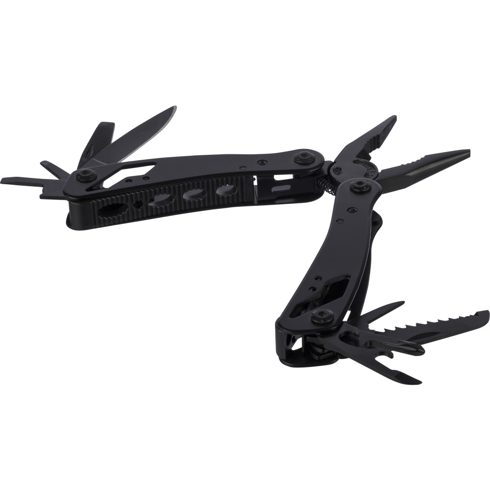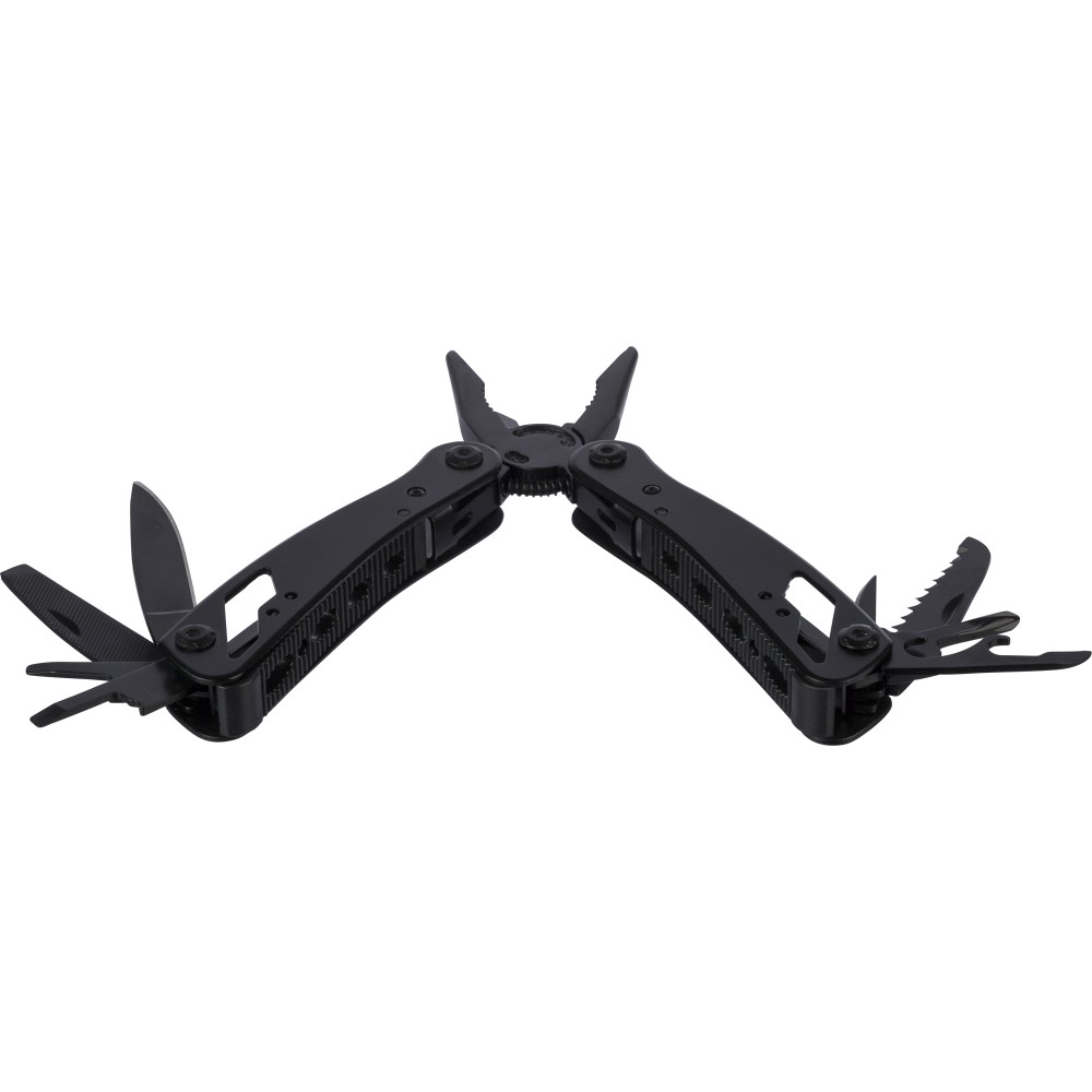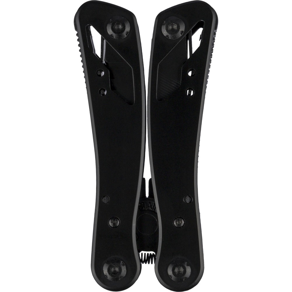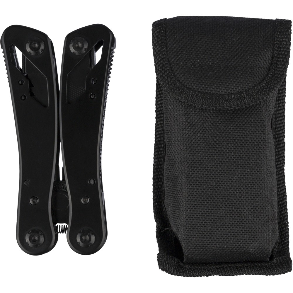 Fekete alumíniumból és rozsdamentes acélból készült multifunkciós szerszám 13 funkcióval, beleértve a késeket, csavarhúzókat, fogót, fűrészt, reszelőt, emelőkart, biteket, rugót, rögzítőrudat, konzervnyitót és támasztékot. Tokkal szállítva, amely tépőzáras övbújtatóval rendelkezik, valamint további külső dobozzal. Darabonként barna kartondobozba csomagolva.