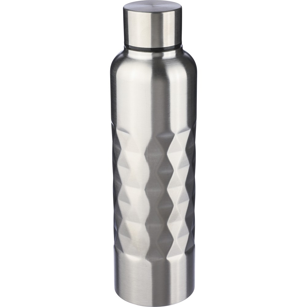 Újrahasznosított 304-es rozsdamentes acélból készült szimplafalú kulacs, 800 ml-es. Gyémánt alakú textúrával a testen, csavaros tetővel és lézergravírozott újrahasznosított logóval. Egyenként csomagolva, barna kartondobozban.